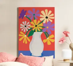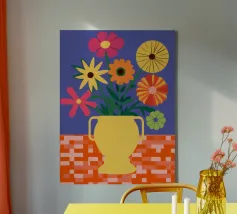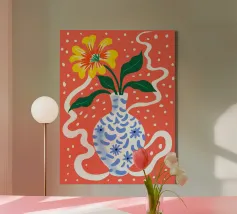 A striped white and blue vase contains yellow and pink flowers, set against a vibrant, quilt-like background of pink, orange, and red floral patterns.