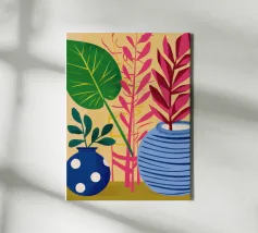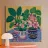 Diverse piante in vaso con fiori e foglie vivaci, in vasi dai motivi unici, disposte su una superficie con un panno a fantasia, creando un'esposizione ricca di texture e colori.