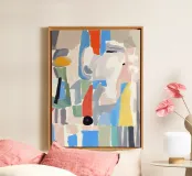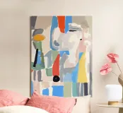 Una varietà di forme e tratti astratti colorati sono assemblati in modo apparentemente casuale per creare una composizione visiva moderna. Audaci spruzzi di blu, rosso e giallo sono accostati a tonalità più tenui di grigio e beige, suggerendo una dinamica vivace e giocosa.