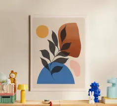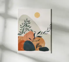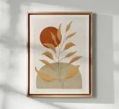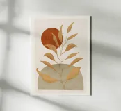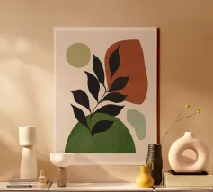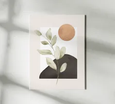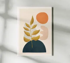 An abstract botanical composition with stylized leaves and geometric shapes in warm, natural tones.
