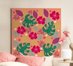 ananas foglie fiori fetta tropicale ibisco mango motivi petali steli verde frutti floreale arancione giallo botanico natura esotico fogliame rosa