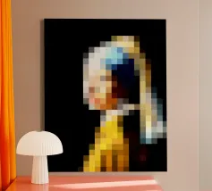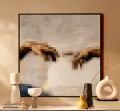 Un primo piano pixelato di mani ispirato all'iconica Creazione di Adamo di Michelangelo. Il design cattura il delicato momento del tocco ravvicinato con audaci forme a blocchi e vibranti tonalità di pixel art, enfatizzando il contrasto tra le dita e lo sfondo. Lo stile semplificato ma espressivo mantiene la profondità emotiva dell'opera d'arte originale, aggiungendo al contempo un'estetica di gioco moderna e retrò.
