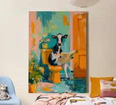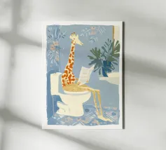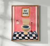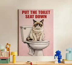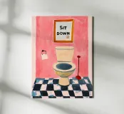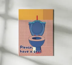 Un'illustrazione umoristica per il bagno degli ospiti: "Siediti, non fare pipì in piedi!". - in colori di tendenza e design minimalista, perfetto per un bagno moderno.