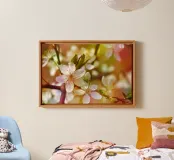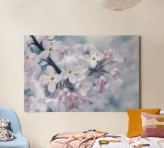 Delicati fiori primaverili su un ramo in una calda atmosfera luminosa. La messa a fuoco morbida e i colori naturali sottolineano la leggerezza e la freschezza della scena.