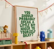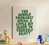 Caratterizzato da audaci scritte verdi disegnate a mano su un morbido sfondo beige, questo pezzo emana calore e autocompassione. Il contrasto sorprendente crea un punto focale che si adatta a qualsiasi stile di arredamento. Perfetto per chi vuole infondere positività e amore per se stesso nel proprio ambiente. Ideale per camere da letto, uffici o spazi abitativi, questa stampa aggiunge un delicato richiamo alle pareti. L'aspetto artigianale delle scritte conferisce all'opera un'atmosfera personale e invitante. Trasformate la vostra casa con questo pezzo edificante che incoraggia un discorso più gentile su di sé e il benessere emotivo.