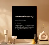 Aggiungete un pizzico di spirito al vostro spazio con la nostra divertente stampa tipografica "Procrastinating". Questo design intelligente presenta una definizione umoristica in stile dizionario della procrastinazione, concentrandosi sulla tendenza universale a fare uno spuntino quando si evitano i compiti. La nitida scrittura serif bianca risalta su un elegante sfondo nero, creando un'estetica sofisticata ma giocosa. Perfetto per l'ufficio, il dormitorio o qualsiasi altra area in cui sia necessario un promemoria per non perdere il lavoro (o per giustificare le pause per gli spuntini), questa versatile opera d'arte fa sorridere sia i procrastinatori che gli intraprendenti. Regalo ideale per studenti e professionisti