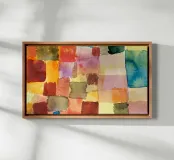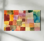 Immergete il vostro spazio nella vibrante arte di Paul Klee con questo accattivante poster "Watercolor Squares". Questo pezzo esemplifica l'esplorazione di Klee del colore e della forma, mostrando un mosaico di rettangoli traslucidi ad acquerello in un ricco spettro di toni terrosi, arancioni caldi e blu freddi. Le pennellate visibili e la consistenza della carta naturale aggiungono una dimensione tattile che invita a un esame più attento. Questa stampa d'arte digitale ad alta risoluzione, resa meticolosamente a 7000x5000 pixel e 300 dpi, cattura perfettamente i delicati lavaggi e le sfumate stratificazioni dell'originale, offrendo un'immagine sofisticata e al passo con i tempi.