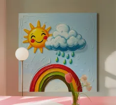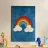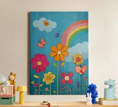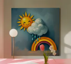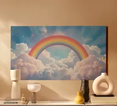 L'immagine mostra un arcobaleno stilizzato con sei archi colorati - dal rosso all'azzurro - su uno sfondo blu strutturato. Alle estremità dell'arcobaleno si trovano due nuvole bianche, che danno al motivo un tocco giocoso. Lo stile è chiaro, grafico e infantile, con colori vivaci e forme semplici che conferiscono un'atmosfera amichevole e ottimista. Ricorda le illustrazioni dei libri per bambini o i progetti per messaggi positivi e inclusivi.