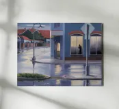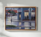 Viewed from a car, a lone figure is silhouetted in a doorway across a rain slicked street. The scene, with its wet reflections and moody lighting, evokes a sense of melancholy, mystery, and urban solitude.