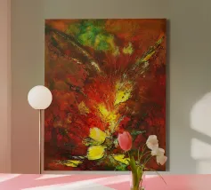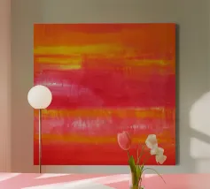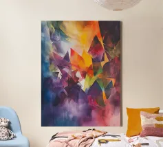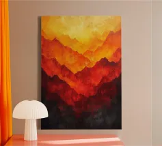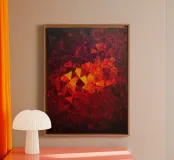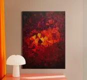 Un dipinto digitale astratto e dinamico, caratterizzato da forme geometriche dai contorni netti e dalle vivaci sfumature rosse, arancioni e gialle, su uno sfondo nero e bordeaux intenso. Il disegno evoca calore, energia e contrasto attraverso il colore intenso e la frammentazione angolare.