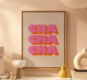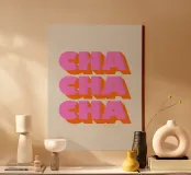Datevi da fare con questa stampa tipografica retrò "Cha Cha Cha"! Le audaci lettere rosa e la vibrante ombra arancione creano un design sorprendente e giocoso, perfetto per aggiungere un tocco di divertimento vintage a qualsiasi spazio. Questa stampa è una celebrazione del ballo, della musica e dei bei momenti. Creato da showmemars