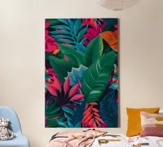 Un motivo coloratissimo di fiori e foglie tropicali in rosa, rosso, arancione e verde acqua, che crea una festa visiva gioiosa ed energica.