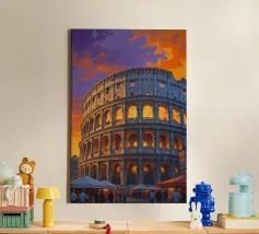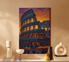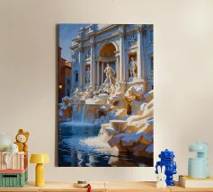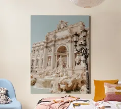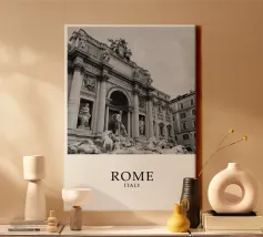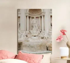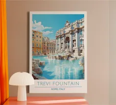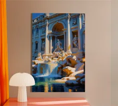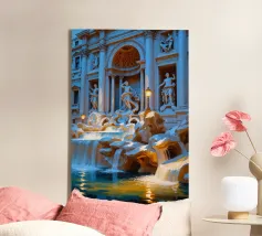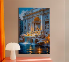 Una scena notturna della Fontana di Trevi a Roma risplende di luce calda. Il capolavoro barocco colpisce per le magnifiche sculture e gli intricati dettagli, circondati da una dolce acqua. Una tipografia elegante incornicia l'atmosfera estiva di una notte mite. Il cielo scuro contrasta armoniosamente con l'illuminazione, che crea maestosamente la scena della fontana. Un invito a vivere la magia di Roma.