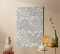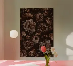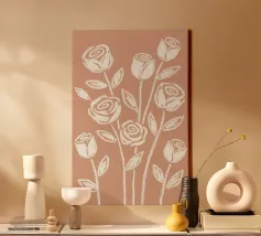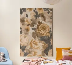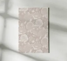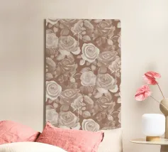 Illustrazione di un motivo ripetuto con fiori di rosa di varie dimensioni e colori neutri, circondati da foglie marroni e accenti punteggiati.