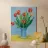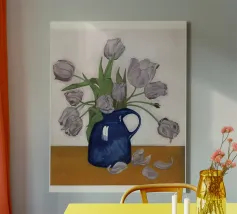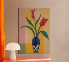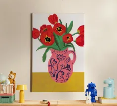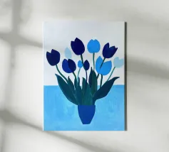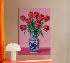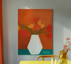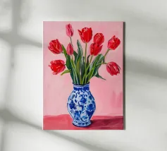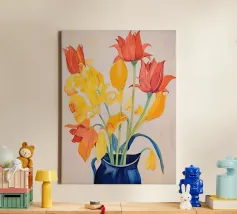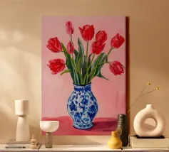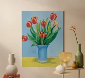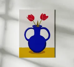 Un classico dipinto di natura morta con tulipani rossi vivaci che svettano in un vaso cilindrico azzurro, posto su un tavolo giallo su uno sfondo blu complementare.