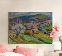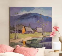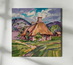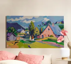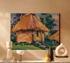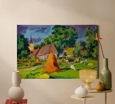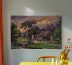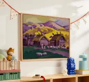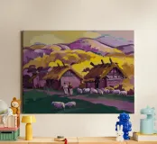 Un dipinto vivace mostra una pittoresca casa col tetto di paglia, circondata da pecore al pascolo in un campo di colore viola e giallo, con dolci colline sullo sfondo, che evocano un senso di vita bucolica.