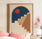 Un'illustrazione architettonica minimalista mostra una serie di archi e scale che conducono verso un sole al tramonto, creando un percorso sereno, onirico e quasi surreale.