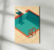 Poster raffigurante una piscina estiva con una scala arancione e riflessi d'acqua stilizzati. Un gioco di ombre, luci grafiche e una tavolozza solare. Perfetto per un look vintage e rinfrescante.
