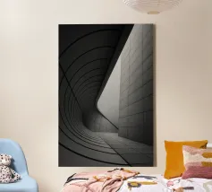 Un poster in bianco e nero di architettura contemporanea: una scala a chiocciola si snoda in un atrio circolare in cemento grezzo, aperto da un grande oculo. Linee curve, luce ad angolo basso e ombre grafiche creano un movimento fluido e zen. Questo poster da parete minimalista conferisce profondità, eleganza e modernità al soggiorno, all'ufficio o al corridoio e si integra con l'arredamento contemporaneo, scandinavo, giapponese o wabi-sabi.
