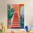 Scale rosse e vivaci conducono attraverso un edificio colorato e semplificato verso un lussureggiante ingresso ad arco, suggerendo un viaggio verso una destinazione bella ed esotica.