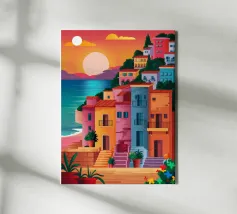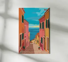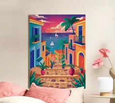Una vista mozzafiato su una vibrante scalinata mediterranea, fiancheggiata da edifici colorati e palme rigogliose. La prospettiva attira lo sguardo verso l'alto, verso un cielo luminoso, creando un senso di ottimismo, avventura e il sogno di una perfetta fuga estiva.