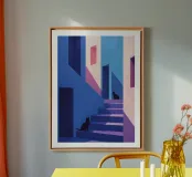 Un'illustrazione moderna e colorata con due gatti neri in un contesto architettonico di vicoli e scale dalle vibranti tonalità di blu e rosa. Il gioco di luci e ombre aggiunge un'atmosfera misteriosa e accattivante, ideale per evocare eleganza e intrigo in uno stile contemporaneo.