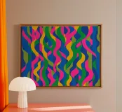 Un audace motivo astratto con un tocco di energia dinamica che simboleggia il movimento e la fluidità. Colori vivaci che evocano temi come l'acqua, la vita e il movimento. Una fusione innovativa di tradizione e modernità per interni contemporanei e minimalisti. Un linguaggio visivo unico che supera i confini culturali.