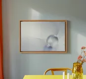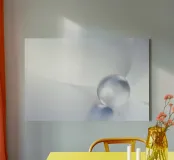 Una sfera trasparente poggia tranquillamente su una superficie bianca e pulita, catturando la luce intorno a sé. La sua forma liscia e cristallina riflette le luci soffuse e rivela le ombre sottili sottostanti, creando un senso di purezza e semplicità. La sfera sembra quasi priva di peso, come una goccia di luce congelata in uno spazio perfettamente calmo.