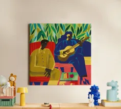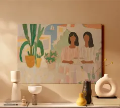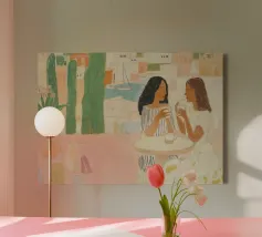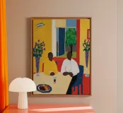 Una scena intima di interni che ritrae due persone, una di carnagione scura e una di carnagione chiara, sedute a un tavolo di colore giallo acceso, forse intente a condividere un pasto o una conversazione. Alle loro spalle, attraverso una finestra, si intravede del fogliame verde che contribuisce a creare un'atmosfera calda e accogliente.