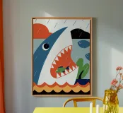 Godetevi una vibrante illustrazione dell'oceano con uno squalo che attacca un pesce in mare con pioggia e nuvole sullo sfondo.
