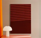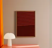 Linee spesse e sottili di colore rosso mattone, dai bordi morbidi e dalla texture sfumata, su uno sfondo marrone scuro e rossastro. Sviluppato dal gioco di luci e ombre delle persiane.