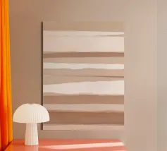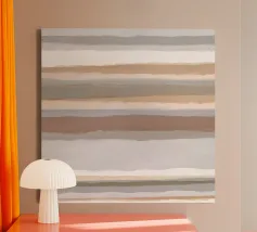 Linee spesse e sottili, color tortora e guscio d'uovo, su uno sfondo rosa polveroso. Sviluppato dal gioco di luci e ombre delle persiane.