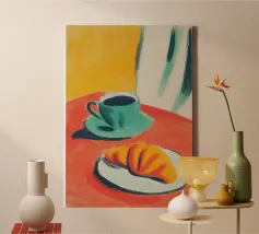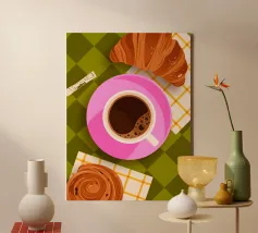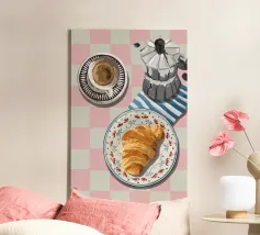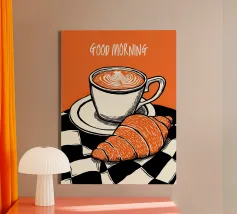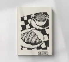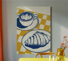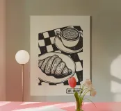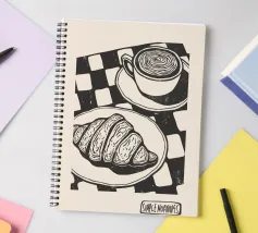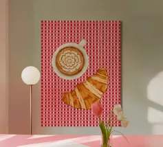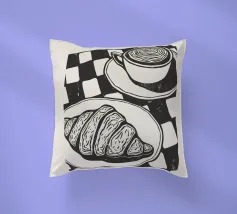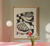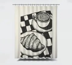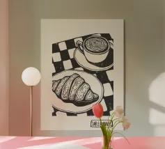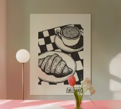 Un'elegante illustrazione in bianco e nero in stile linoleum di un caffellatte mattutino con intricata latte art, abbinato a un croissant sfogliato su una tovaglia a scacchi. Il design pulito e monocromatico aggiunge un tocco minimalista e senza tempo, perfetto per le cucine moderne, le caffetterie e i bar. Un regalo prezioso per gli amanti del caffè, i baristi e gli appassionati della prima colazione.