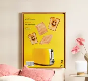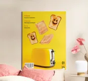 Fette di pane tostato con facce sorridenti fluttuano sopra un tostapane giallo. Sullo sfondo sono presenti testi sul confezionamento, la produzione e la miscelazione, che sottolineano la sostenibilità e il risparmio energetico.