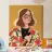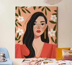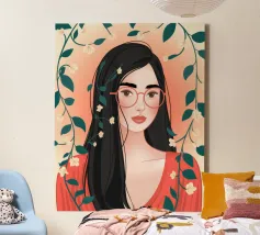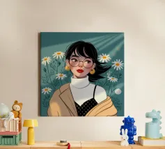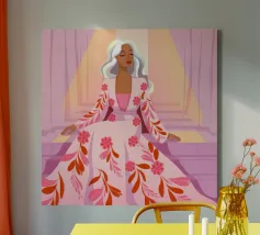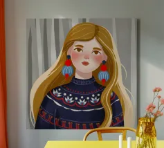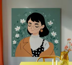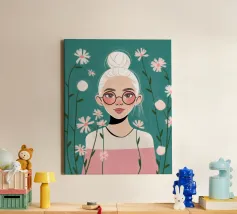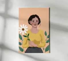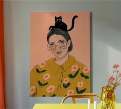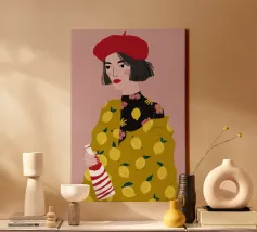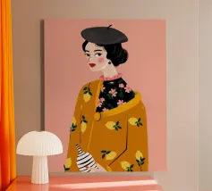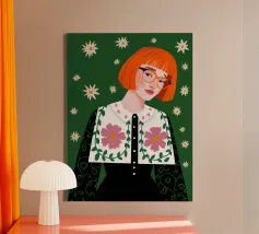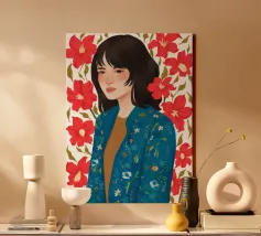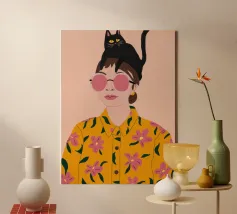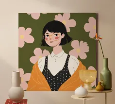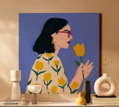 Questa opera d'arte raffigura una persona con capelli corti e biondi che indossa una giacca floreale e tiene in mano un libro. Lo sfondo giallo brillante ne esalta l'essenza chic ed elegante.