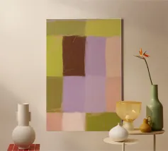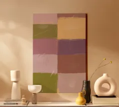 Ispirato allo stile di Mark Rothko, questo dipinto astratto mostra campi di colore delicatamente fusi in viola, verde scuro e beige, che creano un'atmosfera meditativa ed emotiva. Al centro si trova un campo luminoso che conferisce calma e profondità alla composizione. La disposizione minimalista e moderna dei blocchi di colore invita lo spettatore a contemplare l'effetto puro del colore e della forma.