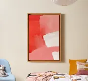 Questa composizione astratta è costruita intorno a una delicata tensione tra i toni audaci del rosso corallo e quelli attenuati del fard, interrotti da un luminoso passaggio in bianco. I colori si incontrano e si sovrappongono in ampi blocchi pittorici, creando un senso di struttura senza rigidità. La tavolozza rimane calda e coesa, con il bianco che agisce come un respiro tranquillo all'interno del campo di colori.