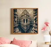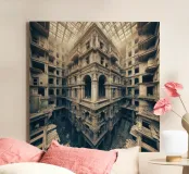 Un intricato edificio abbandonato presenta archi ornati e stratificazioni labirintiche con texture in decadenza sotto una luce naturale diffusa. Il design simmetrico e i dettagli rovinati dalle intemperie evocano mistero e profondità storica in questo ambiente architettonico surreale.