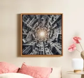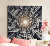 Una disposizione futuristica a spirale di edifici che convergono verso una fonte di luce radiante, creando un modello geometrico ipnotico e una profondità dinamica. I toni monocromatici esaltano l'estetica moderna e surreale.