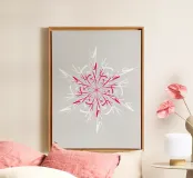 Design invernale: una stella dinamica a sei punte disegnata a mano in bianco e rosa magenta su uno sfondo grigio argento.