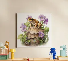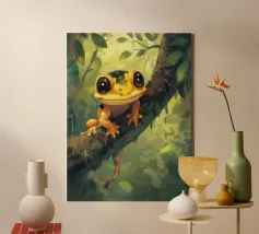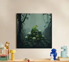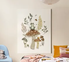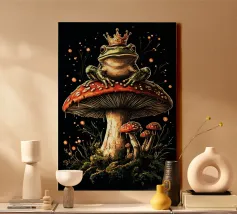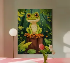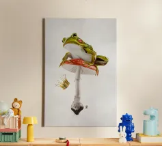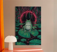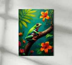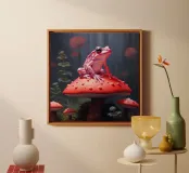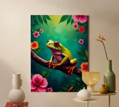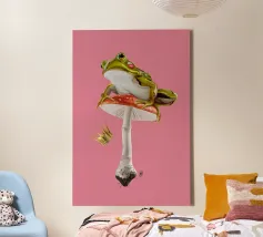 Una scena vivace e stravagante con una rana rosa brillante seduta in cima a un rospo rosso con macchie bianche, circondata da un fogliame rigoglioso e da fiori luminosi in una foresta nebbiosa e incantata. L'atmosfera magica ne esalta la bellezza surreale.