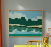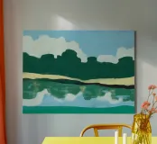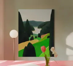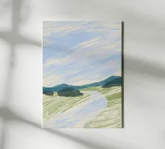 Verdi colline si contrappongono a un cielo pieno di soffici nuvole bianche, mentre in basso il loro riflesso si specchia sull'acqua increspata. L'immagine utilizza una tavolozza di colori semplici e forme astratte per evocare una scena di paesaggio sereno.