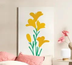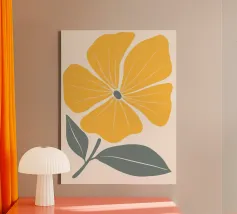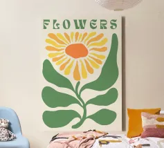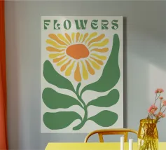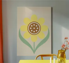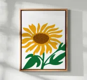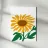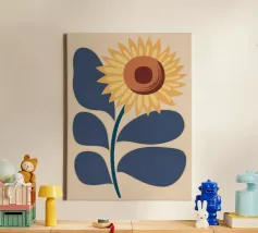 È raffigurato un girasole stilizzato con petali di colore giallo intenso e centro marrone. Foglie e steli verdi aggiungono contrasto ed equilibrio alla composizione.