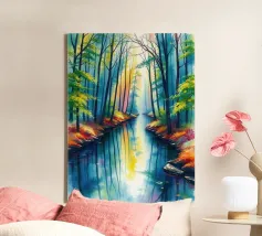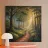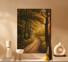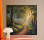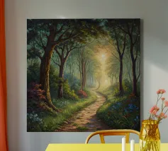 Un dipinto paesaggistico sereno e pittorico che ritrae una tranquilla scena di foresta. Un tortuoso sentiero sterrato serpeggia in un bosco soleggiato, conducendo l'occhio dell'osservatore verso un brillante fascio di luce che attraversa la chioma. Il primo piano è animato da un rigoglioso sottobosco di fiori selvatici nei toni del viola, del bianco e del blu, insieme a un fogliame verde e vibrante. Gli alberi svettanti, con la loro corteccia strutturata, creano un senso di profondità e di scala, mentre la luce soffusa e nebulosa che filtra attraverso le foglie evoca una sensazione di pace e di bellezza naturale. Questo pezzo combina il realismo con un tocco impressionistico,