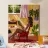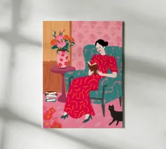 Questo dipinto illustra una persona seduta su una poltrona rossa che legge un libro in una stanza illuminata dal sole. Lo spazio è riempito da piante e da un tavolino con una teiera e una tazza, creando un'atmosfera accogliente e invitante.