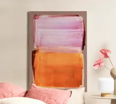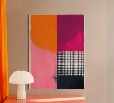 L'arancione brillante incontra il rosa sfumato: quest'opera astratta combina chiarezza geometrica e sfocatura controllata. Cinque strisce verticali sembrano fuoriuscire dal blocco arancione, come il calore, l'energia o l'emozione. L'opera appare controllata e impulsiva allo stesso tempo, ideale per ambienti moderni caratterizzati da forza, dinamismo e colore.