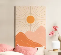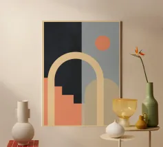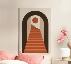 A minimalist composition combining bold stair-like shapes with a radiant sun, opening a window to an abstract orange sea. This artwork balances calm and energy, making it a striking accent piece for any modern living space.