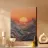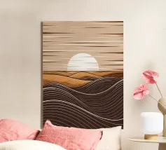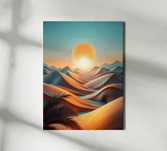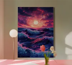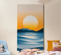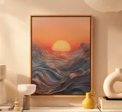 Un ipnotico paesaggio marino astratto che raffigura un sole che tramonta su onde ondulate e fluenti. Le vibranti tonalità arancioni si fondono perfettamente con i blu freddi, creando un'atmosfera serena e mozzafiato.