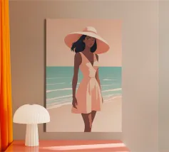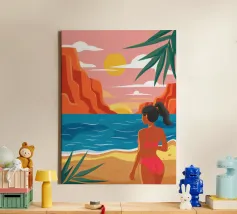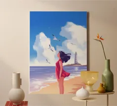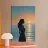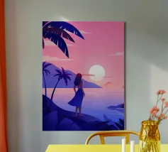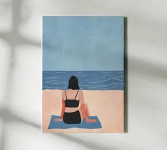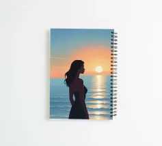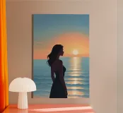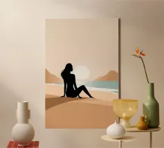 Una donna serena guarda il mare calmo mentre il sole si dissolve all'orizzonte. La luce soffusa e la tavolozza tenue rendono quest'opera d'arte un simbolo di riflessione, pace e calma serale.
