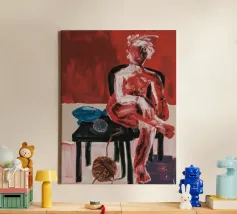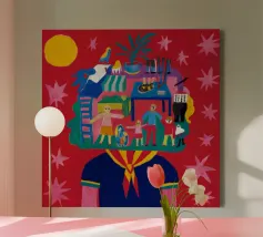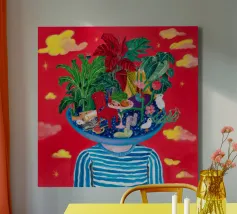 Questo dipinto mostra una figura seduta a una scrivania circondata da libri e piante. Lo sfondo è rosso con stelle bianche, creando un'atmosfera surreale e onirica.